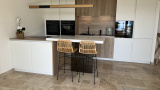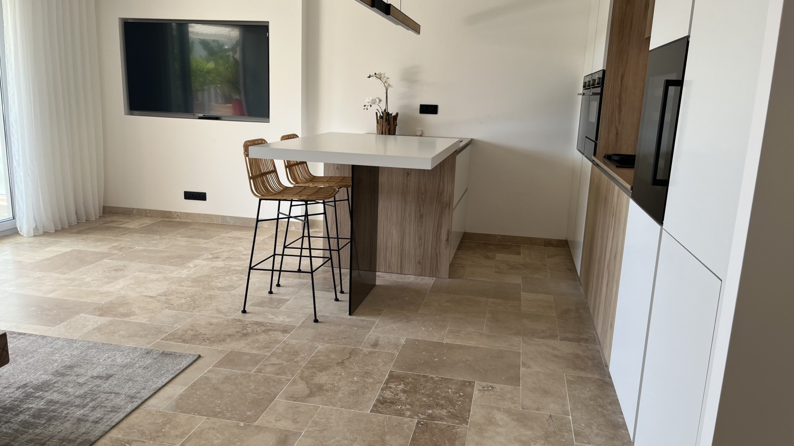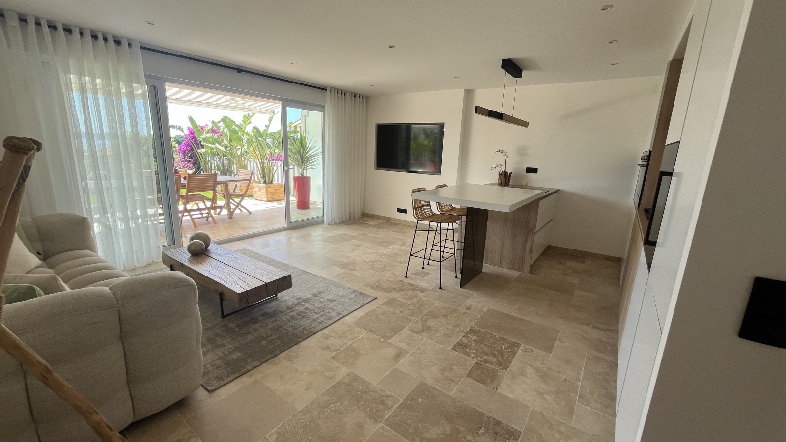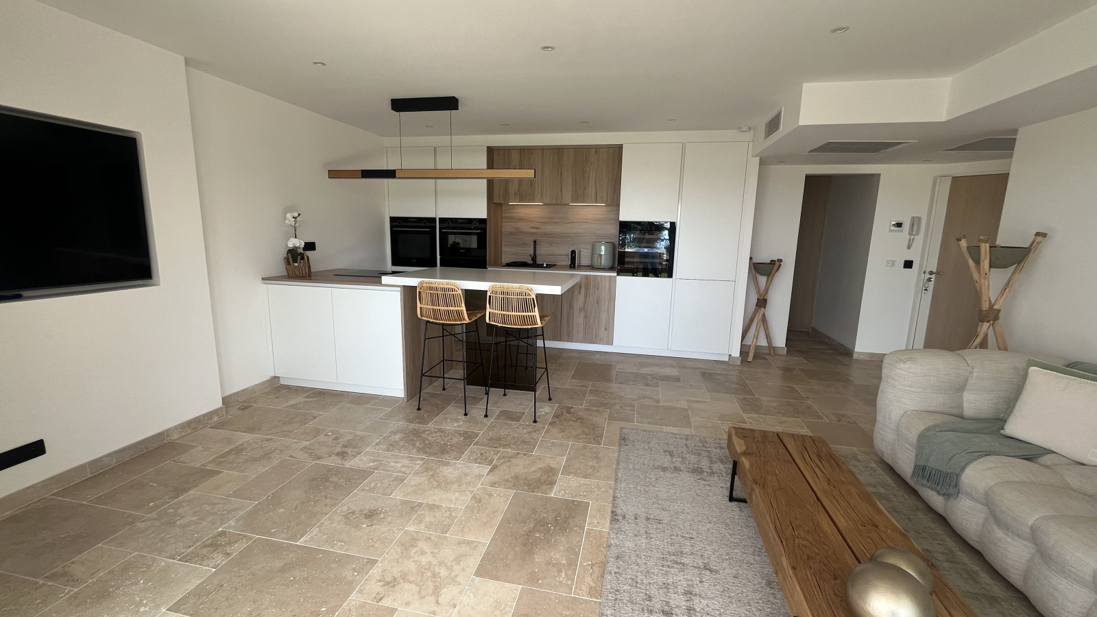L’espace de vie, baigné de lumière, se compose d’une cuisine élégante entièrement équipée ouverte sur un séjour spacieux aux finitions soignées.